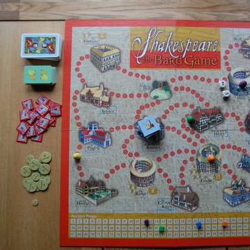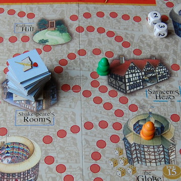 There are fate cards which are sometimes good, sometimes bad. (You get one when you roll an ‘F’ on the dice.) It could say something like this: Thiefs and scoundrels! Lose a prop’ or ‘King James I is impressed with your work - you present a command performance, gain 20 shillings’. At the start you get given 40 shillings. You can lose it, spend it and earn more money by busking or acting out a speech from a play (they are written down on cards for you). The people who are playing with you can vote on your acting abilities – if they give you seven out of ten, then you get seven shillings. Another way to get money is to answer a question about one of Shakespeare’s plays. The questions vary from easy to hard. Here’s an example of an easy one: ‘In which of the following plays are two female characters killed by their husbands?’ They give you three options, and you choose one. (The answer is Othello.)