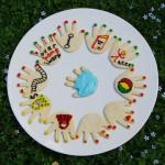 Tamsin: Last year we made Biscuit Feet (see blog 6th August 2007). This year I decided to do Biscuit Hands using the hand-shaped cookie cutters I've had at the back of my drawer and never used. I made the same shortbread dough as for the feet, since it keeps its shape so well. When the biscuits were cooked we decorated them by thinking of all the words or phrases that had a prefix of ‘hand’.