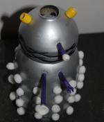 We had another challenge this week - how to make Monkey into a science-fiction character. My friend Maudie was doing Rose Tyler so I thought I'd do someone else from 'Dr Who' - a Dalek. We made it from an old plastic bottle, the top bit for the head of the Dalek and the bottom bit for the tank, spray painted silver.