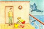 With Friendship running fast before the wind and her rain-barrels full of fresh water once again, it was time for Sally and Tom to slip away back to Four Corner House. They said goodbye to Captain Bailfast, Phlegm, Rita and all the crew. Then they ducked through the Door and went upstairs to change out of their wet clothes. They had no time to lose.
