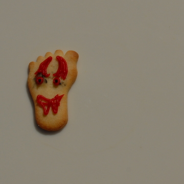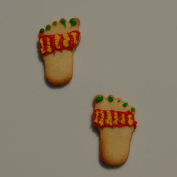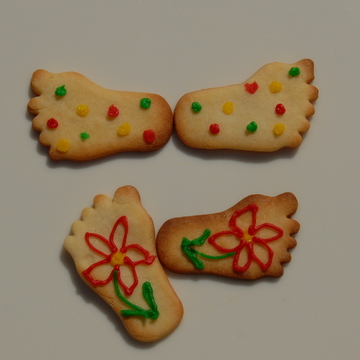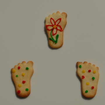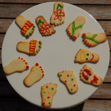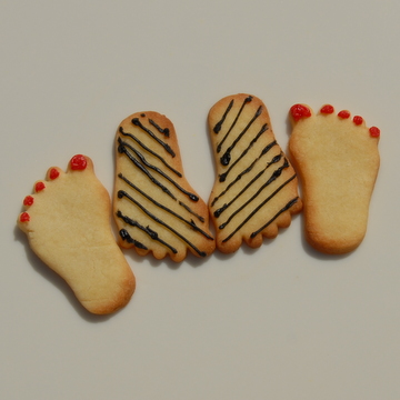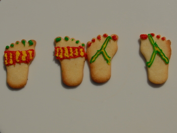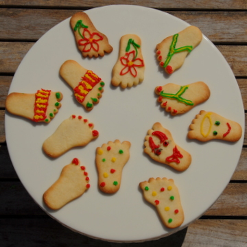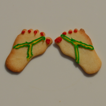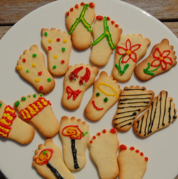 I made Anna-Louise's Redcurrant Tart yesterday so that I could photograph it and following her suggestion of using the left over shortbread dough for biscuits we cut them into feet shapes. Using 'Writing Icing' tubes we turned them into sandals, flip-flops, devils, angels, hippy, stripy and spotty feet. Mike then suggested that we photographed them in different positions, this proved to be great fun and we came up with ...