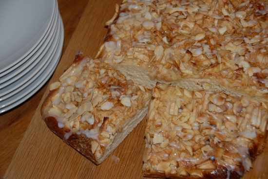 When the dough is proved, make the topping. Beat the egg and milk together, and add the nutmeg. Spoon the egg mixture evenly over the dough. Pile the chopped apples on top, then mix the sugar and cinnamon together and spoon over. Sprinkle the almonds on top. Cook for 15 mins, then turn down the oven temperature to 180 degrees C, Gas Mark 4, and cook for a further 15 to 20 mins, until the dough is browned and puffy at the edges.