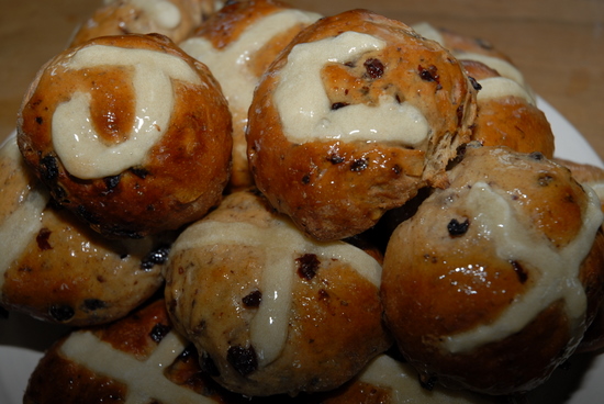 1 tsp quick-rising yeast 450g strong white flour (or half white and half strong stoneground) 2 tsp sugar 2 tbsp milk powder (for bread machines only) 1 tsp salt 2 tsp cinnamon 1 tsp mixed spice 50g butter 2 eggs, beaten 200ml warm water 200g currants or mixed dried fruit For bread machines: Place the ingredients, starting with the dry ingredients and including the cinnamon and mixed spice (but not dried fruit), into the bread machine bowl. Turn on to Basic Raisin Dough mode and add dried fruit when machine requires you to. For hand-making: Place yeast, flour, sugar, salt and spices into bowl. Mix and make a well in the centre. Melt butter, pour into well together with the eggs, warm water and dried fruit. Begin to incorporate the dry and wet ingredients together to form a dough. Turn out on to a well-floured surface and knead until dough bounces back when you press a finger into it (kids love getting involved at this stage). Place dough back in bowl and cover with cling-film. Leave to prove for about 30 mins in a warm place. Turn out dough on to a floured surface and divide into 16 portions. Shape into balls and space well apart on 2 greased baking trays. Cover with cling-film and leave in a warm room (they will prove in about an hour). To cook: Preheat the oven to 220°C, Gas Mark 7. Prepare the paste by mixing approximately 4 tablespoons flour with 4 tablespoons water. Place in a small plastic sandwich bag which will act as a piping bag. Snip one corner off to make a hole about 0.5cm wide. Pipe crosses or initials on the buns. Bake for approximately 15–20 mins. To make the sugar glaze: While the buns are baking prepare the sugar glaze by dissolving 100g sugar in 8 tablespoons water. Boil the mixture for a few minutes in a saucepan or for less time in the microwave, to form a light syrup. As soon as the buns come out of the oven brush them with the sugar glaze and serve immediately so that the butter melts as you spread it. |