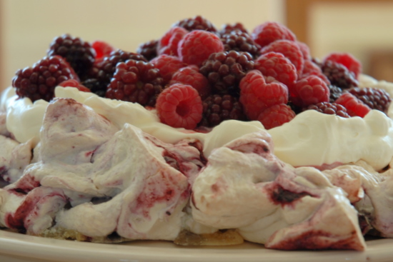 250g caster sugar 250ml blackcurrant coulis (you can buy this or make your own) 500g or more fruit - blackberries and raspberries are best 250ml double or whipping cream Preheat oven to 150ºC/Gas Mark 2. Line a baking tray with baking parchment (or try Flexiware - we love these reusable silicon sheets, nothing ever seems to stick to them). Whisk egg whites until stiff. Gradually add the sugar a tablespoon at a time, whisking well between spoonfuls. This is the important bit: take your time and whisk thoroughly, and you'll be rewarded with a wonderfully glossy stiff meringue. Spoon on to the prepared tray forming a circle about 20cm round with a dip in the middle. Then with a teaspoon, lightly sprinkle half the blackcurrant coulis over the meringue circle and swirl into the meringue with a knife. Bake for about 1 hour but check at 45 mins - the meringue should be firm to the touch but not brown. When cooked, take out and leave to cool. To serve, whip the cream and pile in the centre. Arrange the fruit on top. Serve with the remaining coulis beautifully drizzled over each slice. |