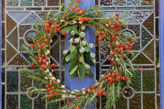 A wire coathanger Willow stems (from a florist) to make a sphere Florist's wire Spruce, evergreen or other seasonal stems Glitter paint (optional) Ribbon (optional) Bend the wire coathanger into a circle. Weave willow stems around to give a dense frame, securing regularly with florist’s wire. Weave your chosen greenery through the willow stems to give a dense, structured wreath. We used rosemary, pussy willow and hips, with bay and eucalyptus berries in the middle, because they smell fabulous. But the wreath reflects the personality of the household, so choose what you like best. Tie a ribbon on if you like, and hang on the front door. For a quicker (and more traditional) wreath, grab a branch of spruce as background, arrange trailing greenery on top, spray with glitter spray, tie one end with florist’s wire covered with a big ribbon, and hang upside down on the front door. |
