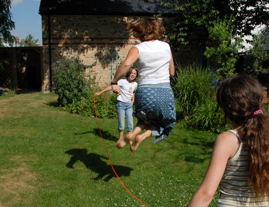 Family skipping is fantastically energetic: use long ropes (plastic ones are lighter on the arms or you can make your own with bobbins and rope available from www.toypost.co.uk) and ask your children to teach you some skipping rhymes. Our kids' current favourites are: