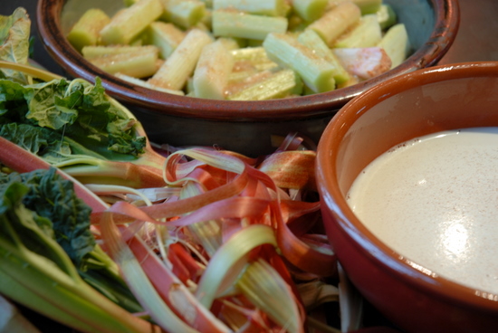 2kg rhubarb 2cm fresh ginger, chopped finely 100g sugar Juice and peel (see below) of 1 unwaxed orange For the crumble topping: 100g wholemeal flour 100g rolled (porridge) oats 100g butter, cut into small cubes 100g Demerara sugar Preheat oven to 180°C, Gas Mark 5. Trim and peel the rhubarb. Cut into 3cm pieces and place in a 2 litre ovenproof dish with the chopped ginger. Sprinkle over sugar and orange juice. Place in oven to cook for about 20 mins while you prepare the topping. To make the topping: mix flour and oats in a bowl. Add cubed butter and rub together to form a breadcrumb consistency. Stir in Demerara sugar and orange peel. Take rhubarb out of oven and sprinkle crumble on top. Return to oven and cook for a further 20 to 30 mins, until browned. Serve hot, with cream or creme fraiche. |