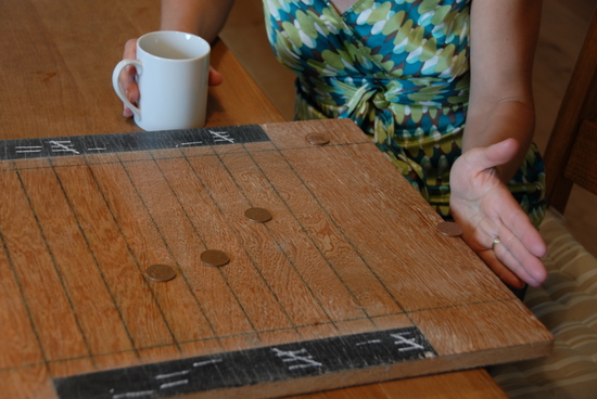 Tamsin's grandfather was a great fan of this old bar game. He made the board she played on as a child and which she still has, now with a lovely sheen on it from all the ha'pennies that have been shoved along it over the years. To play: the aim is to strike the ha'pennies (we use 2p pieces) so they slide cleanly into one of the nine 3cm wide spaces across the board, without touching the dividing lines at all. Five coins are used per go. Each coin is laid slightly overlapping the bottom edge of the board and 'shoved' up the board with the flat of the palm or ball of the thumb. If a shoved coin falls exactly within the lines on the board, a point is scored and chalked up at the side. Players take turns shoving - five coins per go. A line is filled when three chalk marks have been awarded by one person against each line. If a coin subsequently falls on this line the point is passed to the opponent (except on the last point of the game). The lines can be filled in any order. A coin that goes beyond the last line is out of play and cannot be used. Coins that fail to touch the first marker line may be played again. The winner is the first to fill all their lines. |