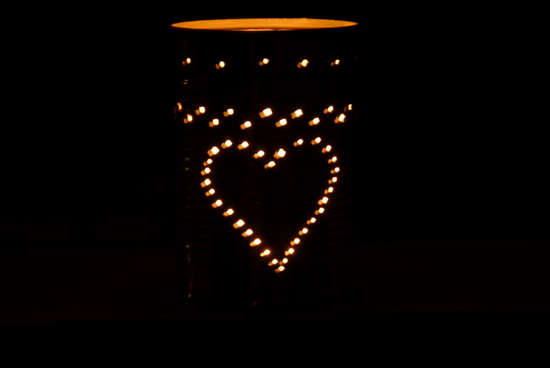 Fill the cleaned cans with water and put them in the freezer. When they’re frozen, take them out and punch small holes around the sides of the tin with a hammer and awl or long nail. You can design patterns or faces, or carve out your names in each one. The bigger the holes, the brighter the lantern will be. If you want to hang the lantern, cut two holes at opposite sides just below the top rim.