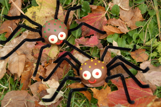 Chocolate teacakes, one per spider 4 black pipe cleaners per spider White chocolate buttons Yellow, red and green icing tubes Twist 4 pipe cleaners together in the middle, making a flat base for the chocolate teacake to sit on. Spread out the 8 legs, making a bend at each ‘knee’ about two-thirds up, and flattening a little foot at the end so the spider can stand up. Nestle a teacake in the middle of each spider leg shape and push the pipe cleaners around to hold tight. Stick white chocolate buttons on with icing for the eyes, and blob some red icing in the middle for the pupils. With coloured icing pens, draw a mouth and put some coloured dots on top of the spider’s head. |