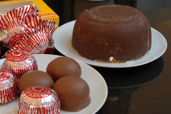 Place the biscuit base on top of the fluff and chocolate dome. Turn the right way up and leave in the fridge to set.