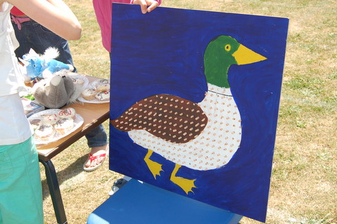 A tombola stall with a difference – just pluck your tickets from the duck to win a prize. This makes a good stall for school fairs or summer fêtes in the garden. You’ll need: A pencil A piece of hardboard or plywood about 60cm by 60cm A drill, with a 5cm to 6cm drill part Poster paint in ducky colours (we used blue, green, yellow, brown and white) Raffle tickets Prizes (old plush toys, books, cakes etc) With the pencil, draw the side outline of a large duck on the hardboard or plywood, showing the body, wing, feet, head, beak and eye. Then drill holes in regular rows about 2cm apart over the body of the duck – Joe (aged 13) did this for us but younger children will definitely need adult supervision. We drilled about 225 holes in total – how many depends on how big your duck is. Once the holes are in place, paint the duck and background and leave to dry. On the day of the fair, roll raffle tickets and push them into the holes. Stick the matching tickets ending in ‘5’ and ‘0’ on to your prizes, and arrange on a stall. Then it’s roll up, roll up for some summer fun!