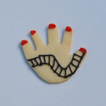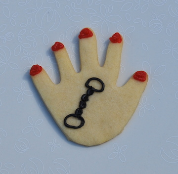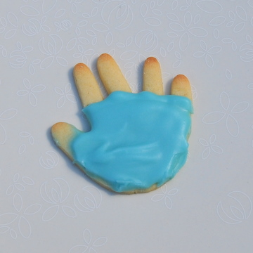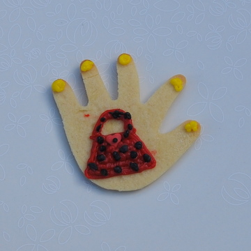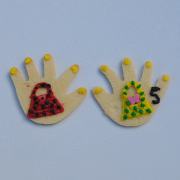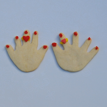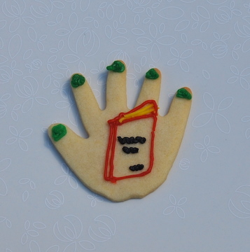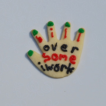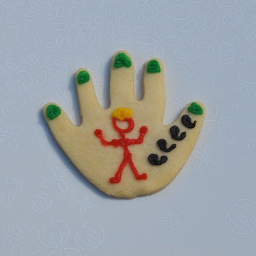 Tamsin: Last year we made Biscuit Feet (see blog 6th August 2007). This year I decided to do Biscuit Hands using the hand-shaped cookie cutters I've had at the back of my drawer and never used. I made the same shortbread dough as for the feet, since it keeps its shape so well. When the biscuits were cooked we decorated them by thinking of all the words or phrases that had a prefix of ‘hand’.